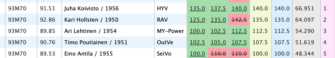 Ennakko-odotus kisatulokselle oli 140-145 kg välillä. Kisan päätavoite oli SM kulta, jolla saa liput MM maajoukkueeseen. Omassa paino- ja ikäluokassa nostajia oli 5. (tulokset liitteessä). Aloituspainoksi valitsin 135 kg, ns. ”varmat raudat”. Olin ajatellut korotukseksi 2. nostoon 140 kg, mutta SVNL:n uuden tulostaulukon monimutkaisuuden vuoksi kilpailutilanteen arvioinnissa meni liikaa aikaa enkä ehtinyt viedä korotuslappua ajoissa, josta seurasi vakiokorotus +2.5 kg ja toisen noston kuormaus 137.5 kg. Halusin varmistaa voiton pyytämällä 3. nostoon 140 kg kuormauksen vaikka potentiaalia olisi ollut 142.5 kg nostoon. Nosto oli helppo, mutta kuitenkin vähällä oli, ettei 2. rankattu nostaja mennyt viimeisellä 142.5 kg nostollaan ohi.